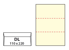 | Le format DL (11 x 22 cm) accueille un A4 plié en trois en accordéon. Ce format est le plus utilisé au monde. Il est aussi appelé C6/5. Toutefois ce format est en train d'être supplanté par le C5/6, qui est légèrement plus grand (114 x 229 mm) destinée surtout pour l’insertion automatique. | ![]() |